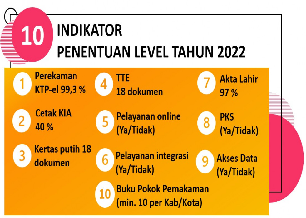 Hingga 31 Maret 2022, sebanyak 4 Disdukcapil Provinsi berhasil menempati Level 4 (Level Terbaik), sebanyak 22 Disdukcapil Provinsi berada di Level 3 (Level Baik), sebanyak 8 Disdukcapil Provinsi di Level 2 (Level Buruk) dan tidak ada yang berada di Level 1 (Level Terburuk).