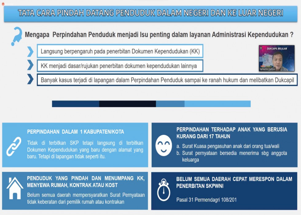 Untuk meningkatkan pemahaman terkait pindah penduduk, Ditjen Dukcapil Kementerian Dalam Negeri menggelar Rakernas Peningkatan Kualitas Layanan Adminduk Dukcapil Belajar Seri 18 dengan tema "Tata Cara Pindah Datang Penduduk Dalam Negeri dan Ke Luar Negeri", Jumat (27/5/2022) melalui Zoom meeting dengan mengundang seluruh Dinas Dukcapil daerah.