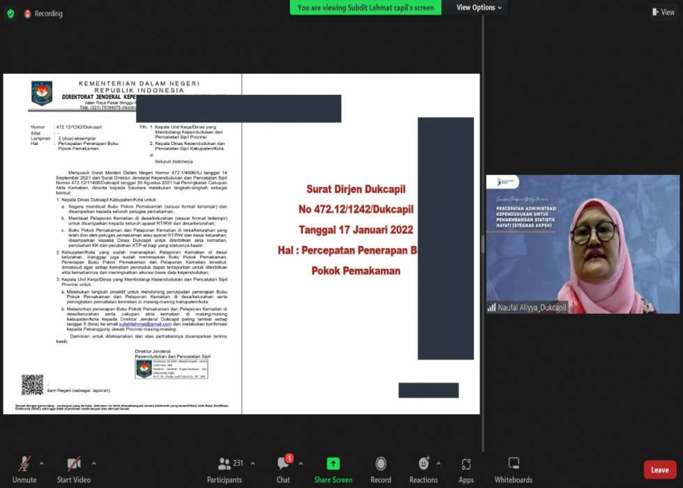 Rapat evaluasi tersebut digelar Kamis (15/9/2022), secara virtual dipimpin oleh Direktur Pencatatan Sipil Handayani dan dihadiri sejumlah Kadis Dukcapil provinsi dan kabupaten/kota yang belum mencapai target penerapan BPP.