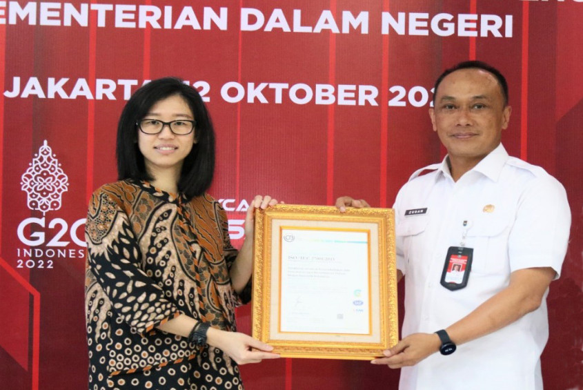 Jakarta - Komitmen Ditjen Dukcapil dalam penguatan Sistem Manajemen Keamanan Informasi (SMKI) dibuktikan dengan diperolehnya Sertifikat ISO 27001:2013 pada Rabu (12/10/2022).