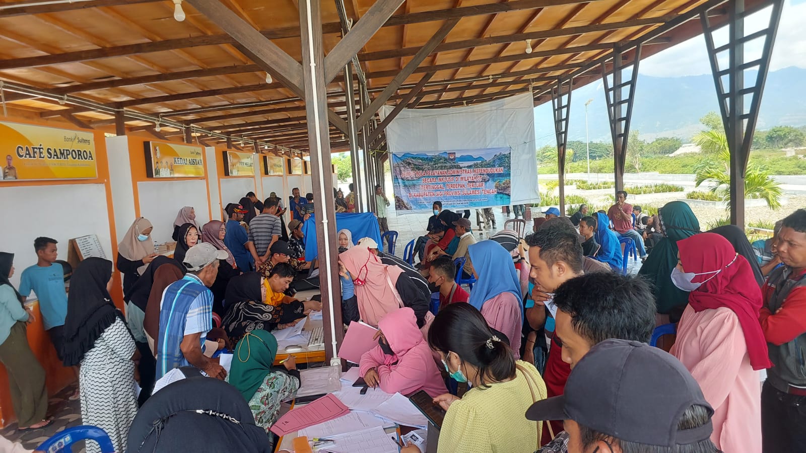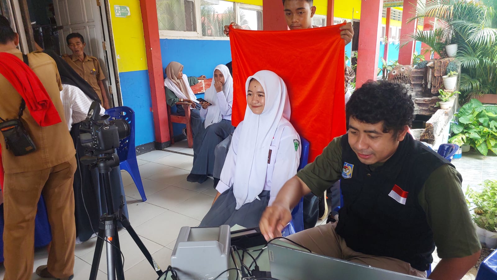Ketua Tim Layanan Dukcapil di Sigi, Sakaria menyerahkan KTP-el bagi pemilih pemula di l di SMAN 1 Sigi. (Foto: Dok. Dafdukcapil)