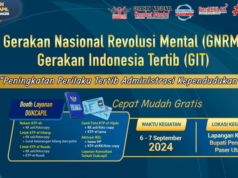 Penajam - Kabar gembira bagi warga Penajam Paser Utara! Mendukung Gerakan Nasional Revolusi Mental (GNRM) dan Gerakan Indonesia Tertib (GIT), Ditjen Dukcapil Kementerian Dalam Negeri menggelar acara spesial yang akan memudahkan masyarakat dalam mengurus berbagai dokumen kependudukan. Acara ini berlangsung selama dua hari, mulai 6 hingga 7 September 2024, di Lapangan Kantor Bupati Penajam Paser Utara (PPU).