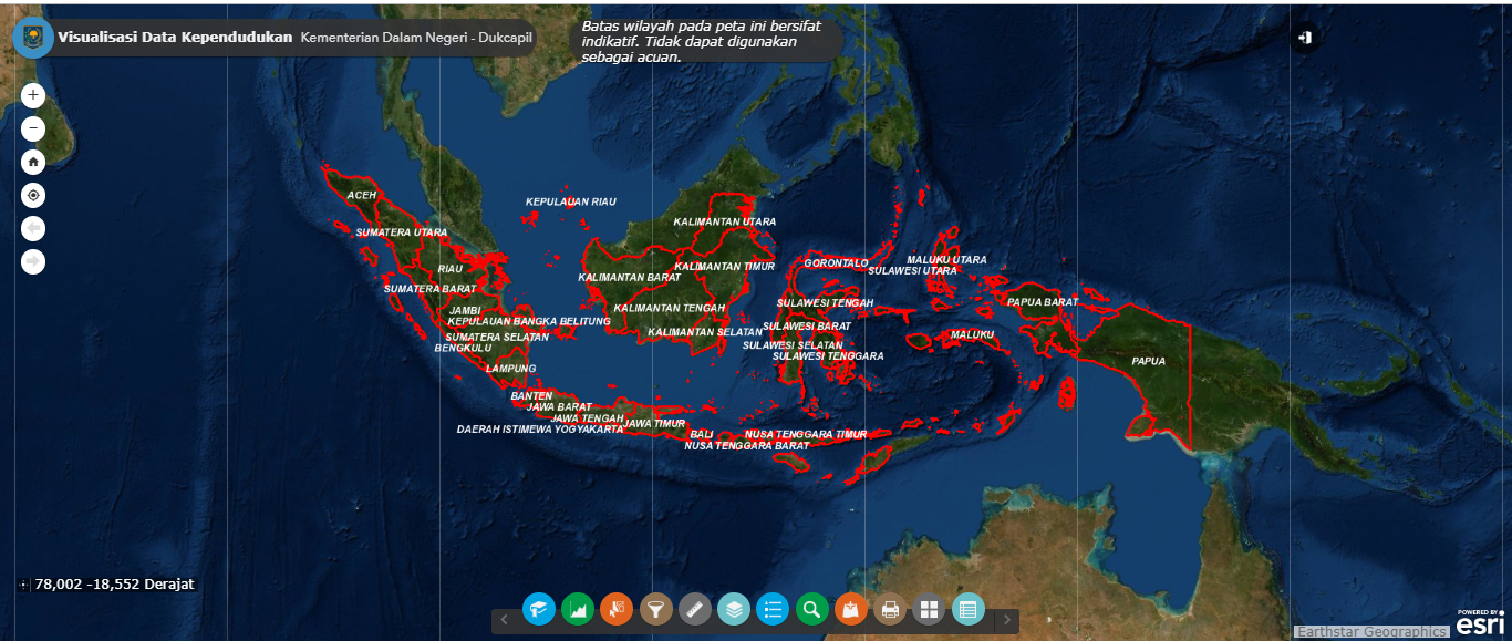 https://gis.dukcapil.kemendagri.go.id/arcgis/home/ akan tersaji peta 34 provinsi seluruh Indonesia. Pada setiap provinsi akan terbaca lengkap masing-masing jumlah kabupaten/kota hingga jumlah kecamatan, desa, kelurahan selain jumlah penduduk, luas wilayah dan jumlah kepala keluarga. ÂÂ