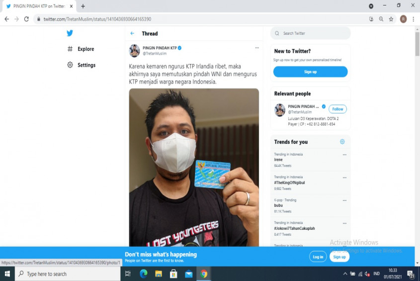"Sbnrnya saya g ada masalah dg negeri ini, tp begitu ngurus KTP baru, suruh fotocopy ini itu, bolak balik, pas dateng suruh daftar online, pas online websitenya SAMPAH, call centre ditelpon ga ada yg angkat, ya ada yang salah dengan negeri ini, lbh baik dukcapil ksh ke Microsoft," kicau Tretan, Selasa (29/6/2021).