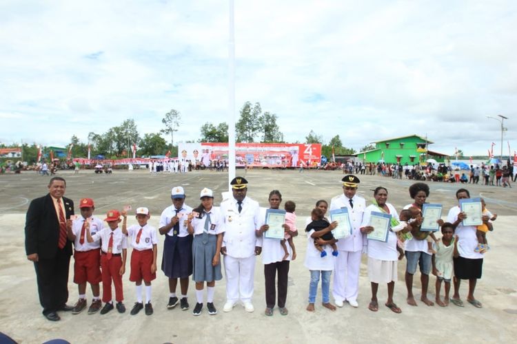 Asmat - Dinas Kependudukan dan Pencatatan Sipil (Disdukcapil) Asmat merayakan Hari Kemerdekaan Indonesia dengan cara menarik. Disdukcapil Asmat menerbitkan Kartu Identitas Anak (KIA) bagi ribuan anak di Asmat bertepatan pada Upacara Peringatan Hari Ulang Tahun ke-74 Republk Indonesia (HUT ke-74 RI) di Lapangan Pelabuhan Agats, Sabtu (17/8/2019).