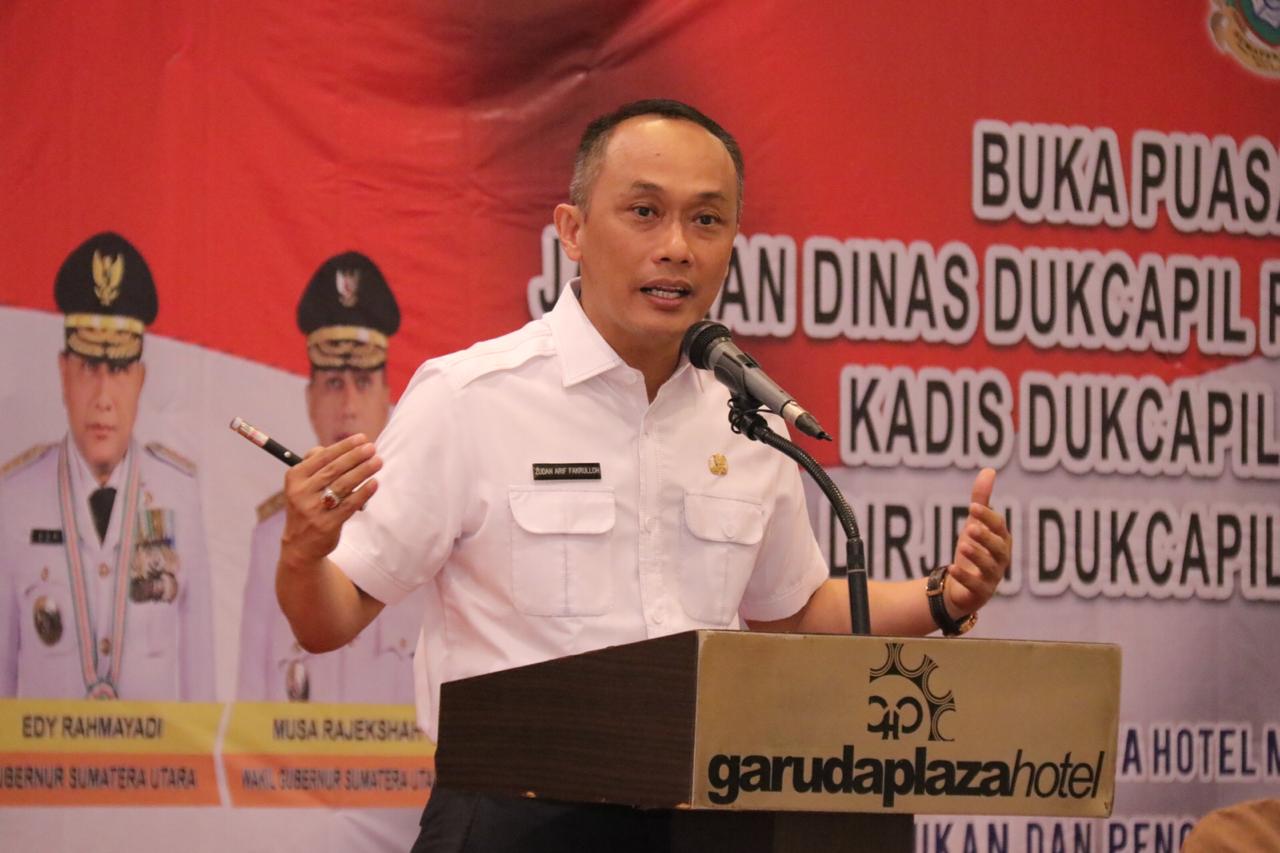 Medan - Semangat yang tidak pernah putus didengungkan sejak hari pertama Prof. Zudan Arif Fakrulloh menjabat Direktur Jenderal Kependudukan dan Pencatatan Sipil (Dirjen Dukcapil) Kementerian Dalam Negeri (Kemendagri) adalah memberikan pelayanan administrasi kependudukan yang membahagiakan masyarakat. Filosofi semangat itu pula yang disodorkan kepada para jajaran Kepala Dinas Dukcapil di Provinsi Sumatera Utara agar bisa dijabarkan dalam langkah-langkah konkret pelayanan lokal.