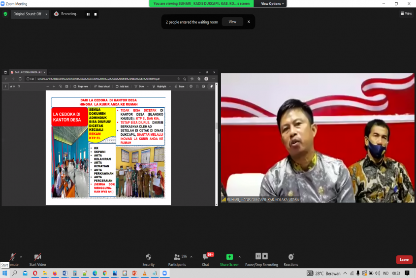 Kesempatan berikutnya giliran Kadis Buhari dari Disdukcapil Kabupaten Kolaka Utara memaparkan aplikasi Si Laku O2T atau Sistem Layanan Adminduk Kolaka Utara-Offline Online dan Terintegrasi.