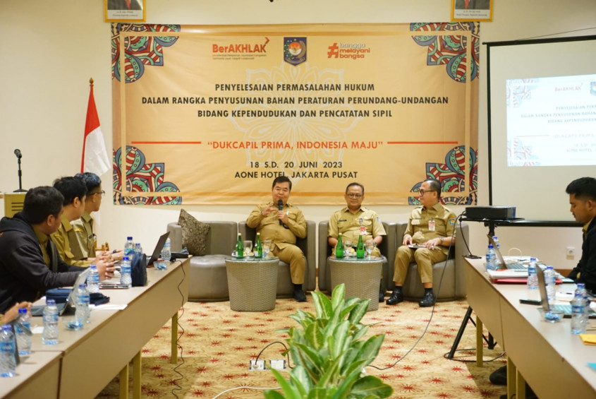 Rapat yang diselenggarakan Tim Kerja Perundang-undangan (PUU) pada Sekretariat Ditjen Dukcapil, menghadirkan Sesditjen Dukcapil Hani Syopiar Rustam, Direktur Pendaftaran Penduduk dan Pencatatan Sipil (Dafdukcapil) Handayani Ningrum, narasumber Kepala Biro Hukum Kemendagri, R. Gani Muhamad, Kabag Advokasi dan Bantuan Hukum Biro Hukum Kemendagri Wahyu Chandra, Ketua Tim Kerja PUU Lilie Satuti K Wigati, serta para pejabat administrator (Eselon III) dan pejabat pengawas (Eselon IV) di lingkungan Ditjen Dukcapil Kemendagri.