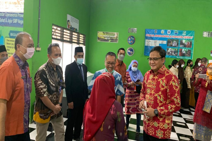 David Yama selaku Direktur Pendaftaran Penduduk Ditjen Dukcapil bersama jajaran Disdukcapil Kota Surabaya juga turut meninjau implementasi KatePay ini di SMPN 42 Surabaya pada Kamis (16/6/2022).