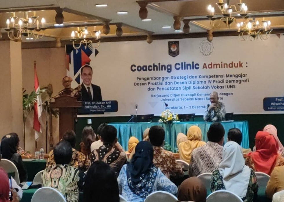 Acara Coaching Clinic ini dilaksanakan di Hotel Sahid Jaya Solo yang dibuka oleh Wakil Rektor Bidang Akademik UNS Prof. Ahmad Yunus, dengan Keynote Speaker Dirjen Dukcapil Zudan Arif Fakrulloh.