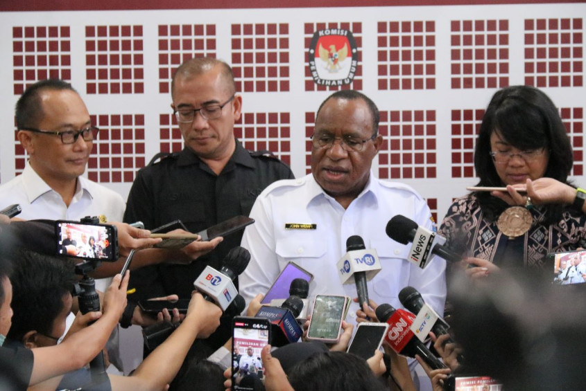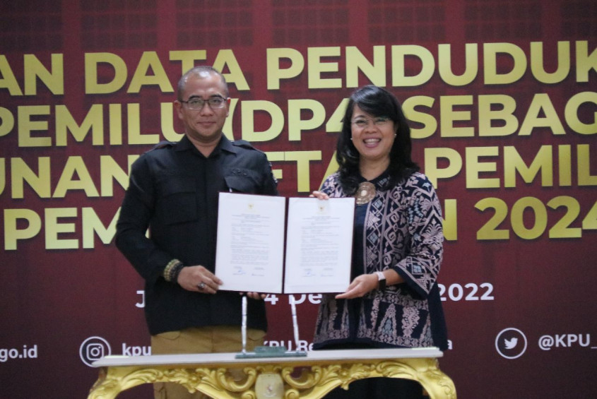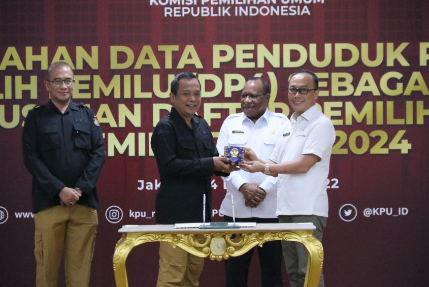 Jakarta - Wakil Menteri Dalam Negeri John Wempi Wetipo menyerahkan Data Penduduk Potensial Pemilih Pemilu (DP4) untuk Pemilu Tahun 2024 kepada Ketua Komisi Pemilihan Umum (KPU) Hasyim Asy'ari. Pada saat yang sama, Staf Ahli Menteri Luar Negeri Bidang Sosial Budaya dan Pemberdayaan Masyarakat Indonesia di Luar Negeri, Siti Nugraha Mauludiah juga menyerahkan DP4 Luar Negeri kepada Ketua KPU Hasyim Asy'ari.