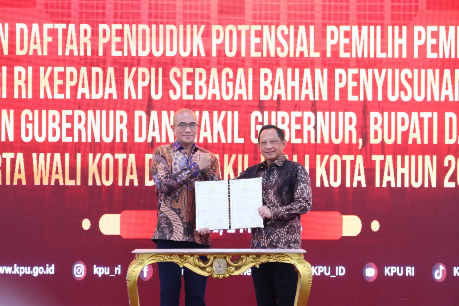 Data penting itu diserahkan Menteri Dalam Negeri M. Tito Karnavian ke Komisi Pemilihan Umum Republik Indonesia (KPU RI). Penyerahan dilakukan Tito secara simbolis kepada Ketua KPU Hasyim Asyari, di Ruang Sidang Utama Kantor KPU RI, Jalan Imam Bonjol, Menteng, Jakarta Pusat, Kamis (2/5/2024).