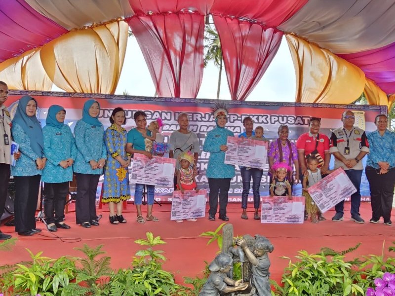 Jayapura - Ketua Umum Tim Penggerak Pemberdayaan dan Kesejahteraan Keluarga (TP PKK) Pusat, Ny. Tri Tito Karnavian, menyerahkan dokumen kependudukan kepada anak-anak di Kota Jayapura dalam rangkaian perayaan Hari Anak Nasional. Acara ini berlangsung meriah bersamaan dengan kunjungan Presiden Republik Indonesia, Joko Widodo, dan Ibu Iriana Joko Widodo di Papua.