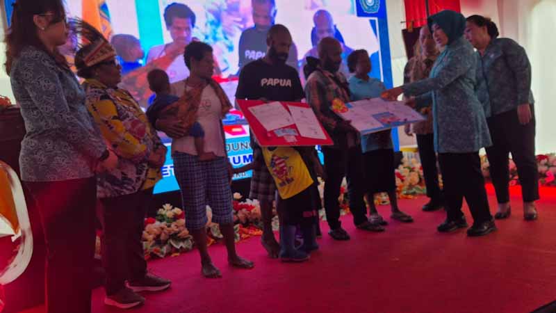 Ny. Tri Tito Karnavian, didampingi Kepala Dinas Dukcapil Kota Jayapura, Raymond J.W. Mandibondibo, menyerahkan dokumen kependudukan berupa Kartu Keluarga, Akta Kelahiran, dan Kartu Identitas Anak kepada perwakilan anak di Kampung Skouw Mabo.