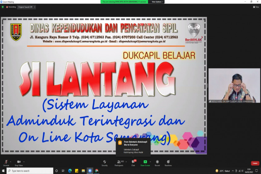 Dalam kesempatan pagi ini, Jumat (4/3/2022) Disdukcapil Kota semarang diberikan kesempatan untuk menjadi narasumber dalam acara Dukcapil Belajar Sesi 9 dengan tema SILANTANG atau Sistem Layanan Administrasi Kependudukan Terintegrasi dan Online.