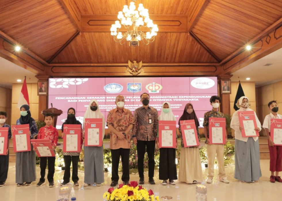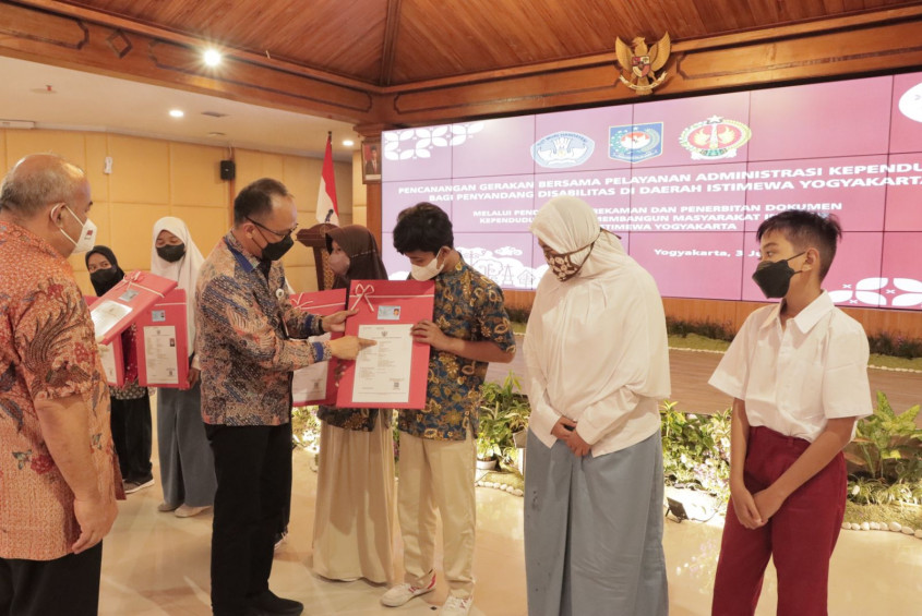 Yogyakarta - Pencanangan gerakan bersama pendataan disabilitas kini telah mencapai Daerah Istimewa Yogyakarta. Acara ini dihadiri oleh Wakil Gubernur DIY Sri Paduka Paku Alam X, Angkie Yudistia Staf Khusus Presiden, dan Dirjen Dukcapil Zudan Arif Fakrulloh beserta Tim Ditjen Dukcapil bertempat di Gedhong Pracimosono, Komplek Kepatihan Yogyakarta, Jumat (3/6/2022).