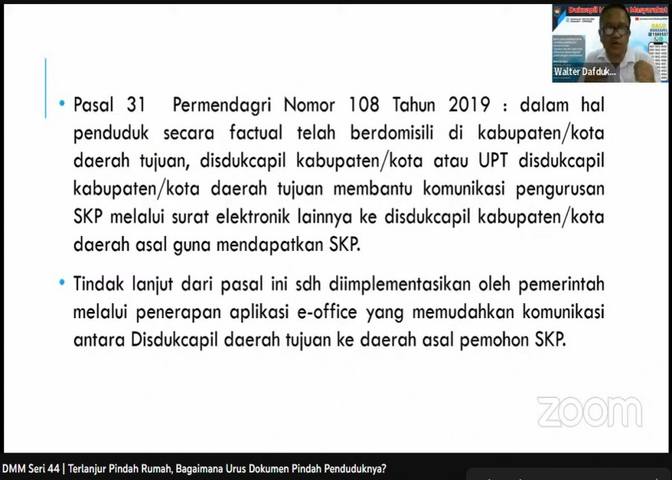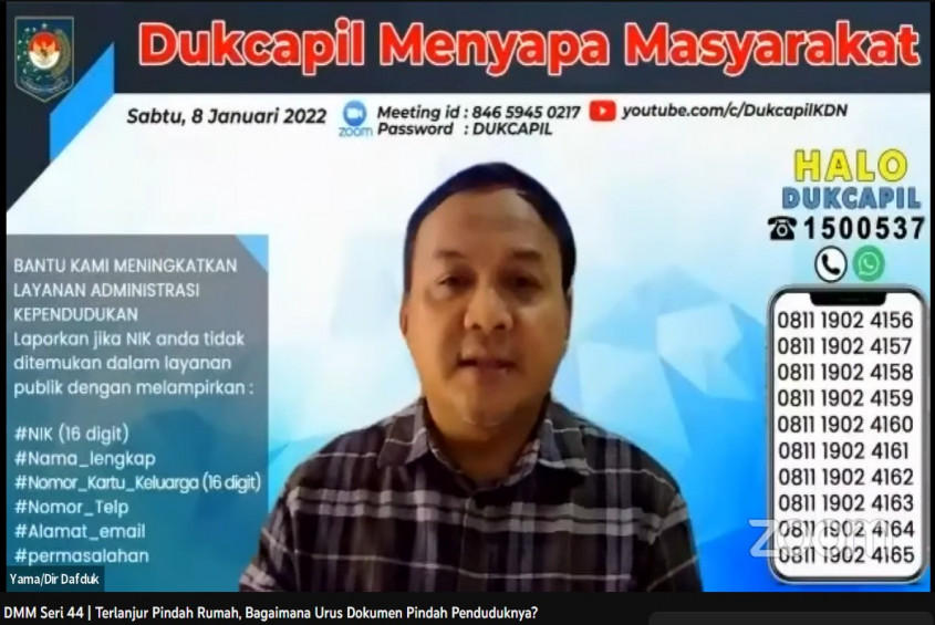 Topik hangat ini dibahas dalam Dukcapil Menyapa Masyarakat (DMM) Seri 44 bertema "Terlanjur Pindah Rumah, Bagaimana Urus Dokumen Pindah Penduduknya?" lewat Zoom Meeting dan disiarkan secara langsung di Youtube kanal Ditjen Dukcapil KDN, Sabtu (19/11/2022)