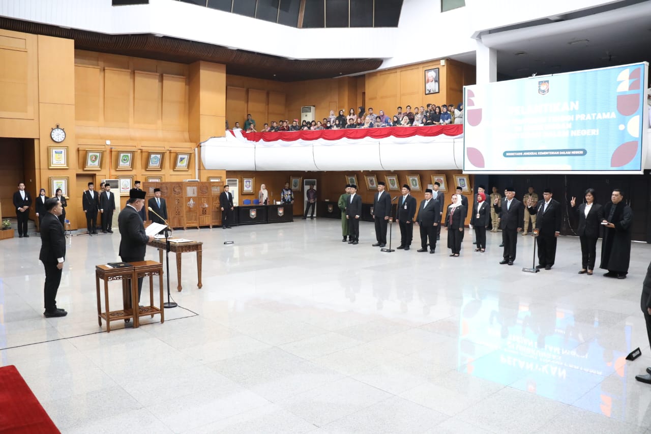 Jakarta - Sekretaris Jenderal (Sekjen) Kementerian Dalam Negeri (Kemendagri) Tomsi Tohir melantik 16 pejabat pimpinan tinggi pratama di lingkungan Kemendagri. Pelantikan berlangsung di Gedung Sasana Bhakti Praja (SBP), Kantor Pusat Kemendagri, Jakarta, Jumat (23/5/2025).