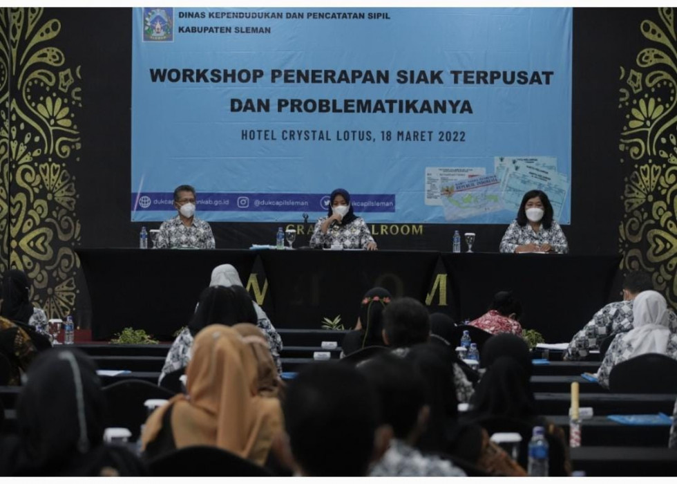 Sleman - Dinas Kependudukan dan Pencatatan Sipil Kabupaten Sleman menggelar workshop implementasi penerapan Sistem Informasi Administrasi Kependudukan (SIAK) Terpusat di Crystal Lotus Hotel, Jum’at (18/3/2022).