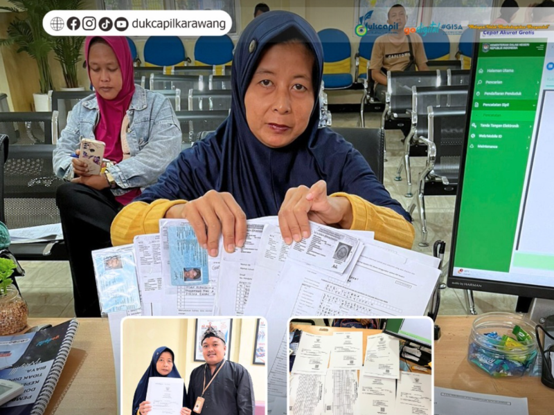 Karawang - Ibu Pipit Pitriah, warga Kabupaten Karawang, mendatangi Kantor Dinas Dukcapil Karawang untuk mengajukan sejumlah perbaikan dan pembuatan dokumen kependudukan bagi keluarganya. Pengajuan ini merupakan bagian dari pelayanan terintegrasi 16 in 1, di mana 16 permohonan administrasi kependudukan dapat diselesaikan melalui satu loket, bahkan selesai dalam satu hari.