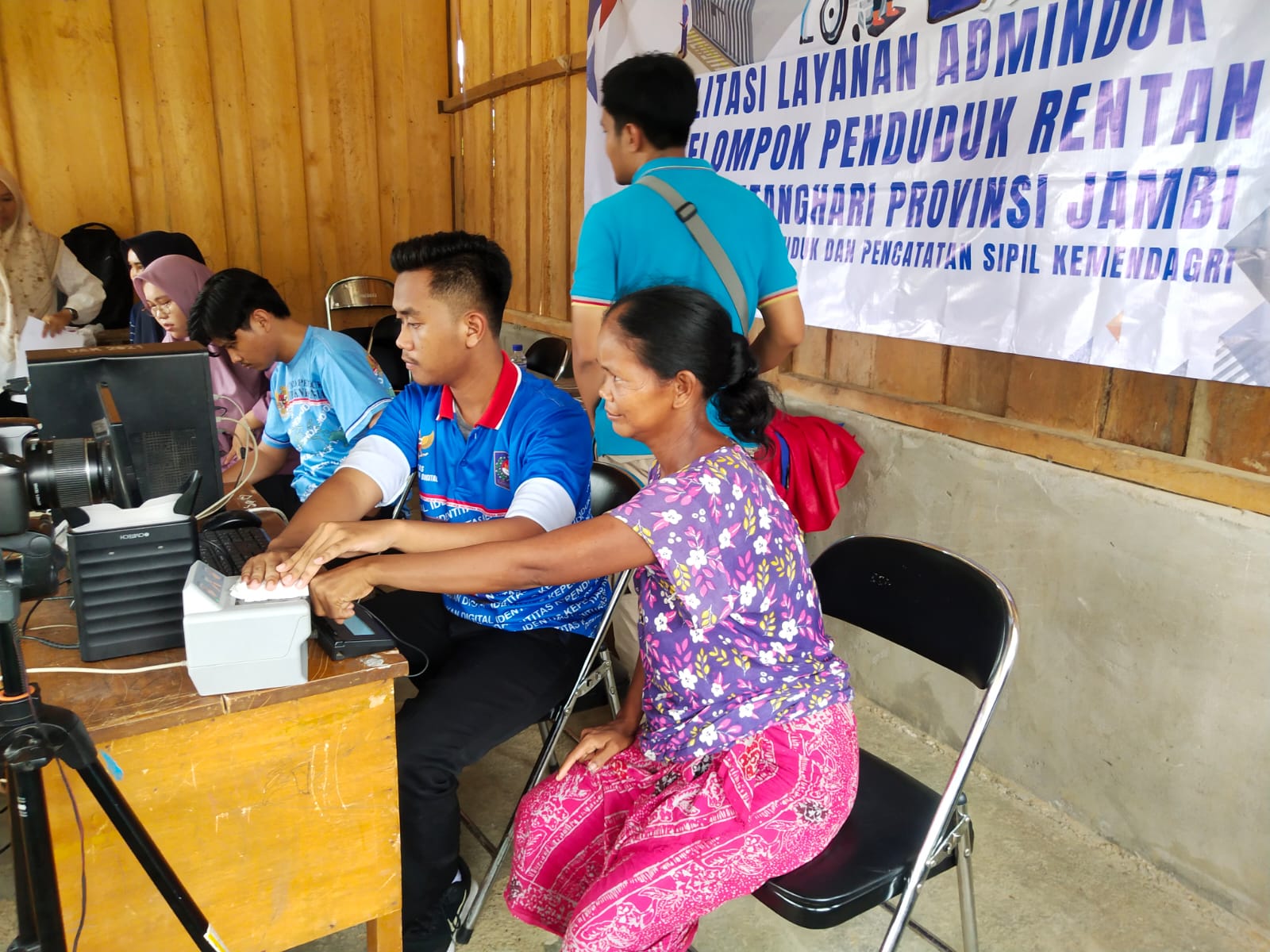 Bersama Dukcapil Kabupaten Batanghari, Tim Jemput Bola Layanan Adminduk Ditjen Dukcapil menerbitkan identitas kependudukan bagi warga SAD di Desa Hajran, tepatnya di Rumah Pintar Suku Anak Dalam dengan menempuh perjalanan darat hampir 5 jam atau 193,9 kilometer dari Muara Bulian, ibukota Kabupaten Batanghari.