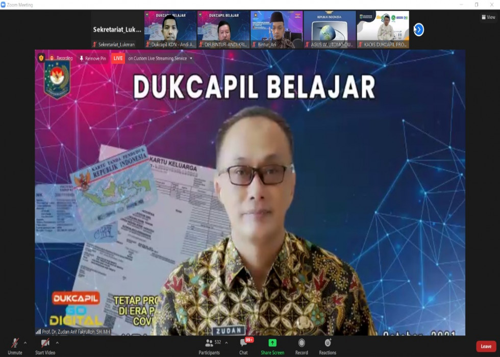Hal itu Zudan sampaikan saat membuka acara Dukcapil Belajar yang dilaksanakan secara daring, Jumat (29/10/2021). Tururt hadir dalam acara tersebut, seluruh jajaran Dinas Dukcapil daerah se-Indonesia.