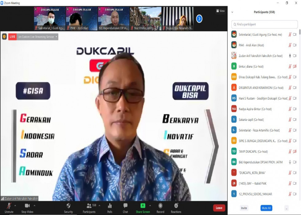 Hal itu Zudan sampaikan saat dirinya memberikan arahan saat membuka acara Dukcapil Belajar yang diikuti seluruh aparatur Dinas Dukcapil seluruh Indonesia, secara daring melalui aplikasi Zoom, pagi ini, Jumat (05/11/2021).