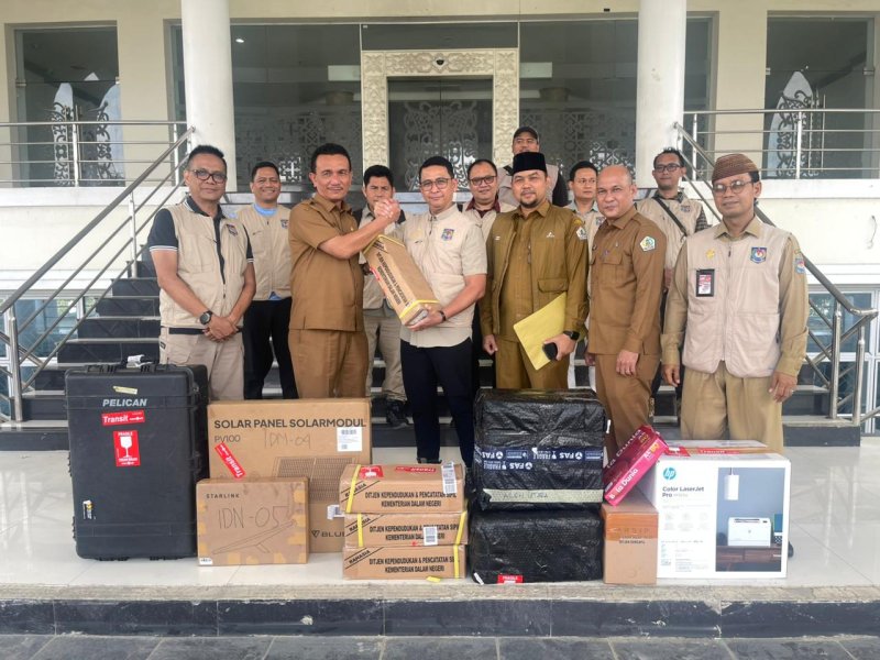 Direktur PIAK Muhammad Nuh Al Azhar menyerahkan bantuan sarana dan prasarana pendukung layanan Adminduk berupa 8.000 keping blanko KTP-el, satu set power station, satu set perangkat Starlink, satu set solar panel, satu set perangkat rekam dan cetak KTP-el, dua set printer kertas, dua ribbon, satu film, serta satu set cleaning kit. (Foto: Dok. Dit. PIAK Ditjen Dukcapil)
