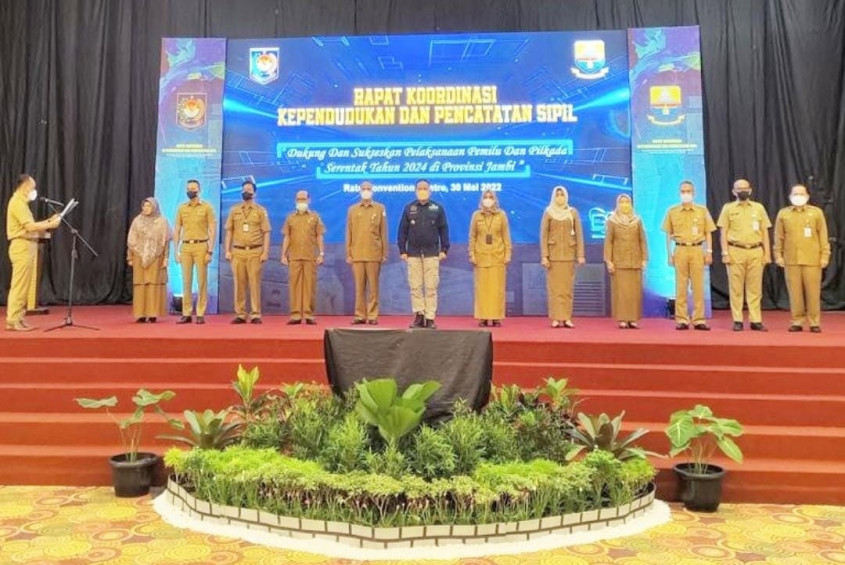 Jambi - Dinas Dukcapil Provinsi Jambi menggelar Rapat Koordinasi Kependudukan dan Pencatatan Sipil (Rakor Dukcapil) bertema "Dukcapil Dukung dan Sukseskan Pelaksanaan Pemilu dan Pilkada Serentak Tahun 2024 di Provinsi Jambi", di Ratu Convention Center, Kota Jambi, Senin (30/5/2022).