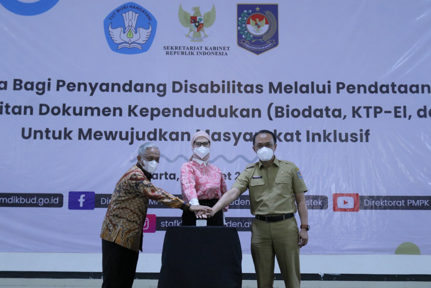 Jakarta - Kementerian Dalam Negeri melalui Ditjen Dukcapil berkolaborasi dengan Kantor Staf Khusus Presiden dan Kemendikbudristek melakukan Peluncuran Gerakan Bersama Pelayanan Adminduk untuk Penyandang Disabilitas pada Senin (14/3/2022). Hadir di acara Staf Khusus Presiden Angkie Yudistia, Dirjen Dukcapil Kemendagri Zudan Arif Fakrulloh dan Dirjen Dikdasmen Kemendikbudristek Djumeri.