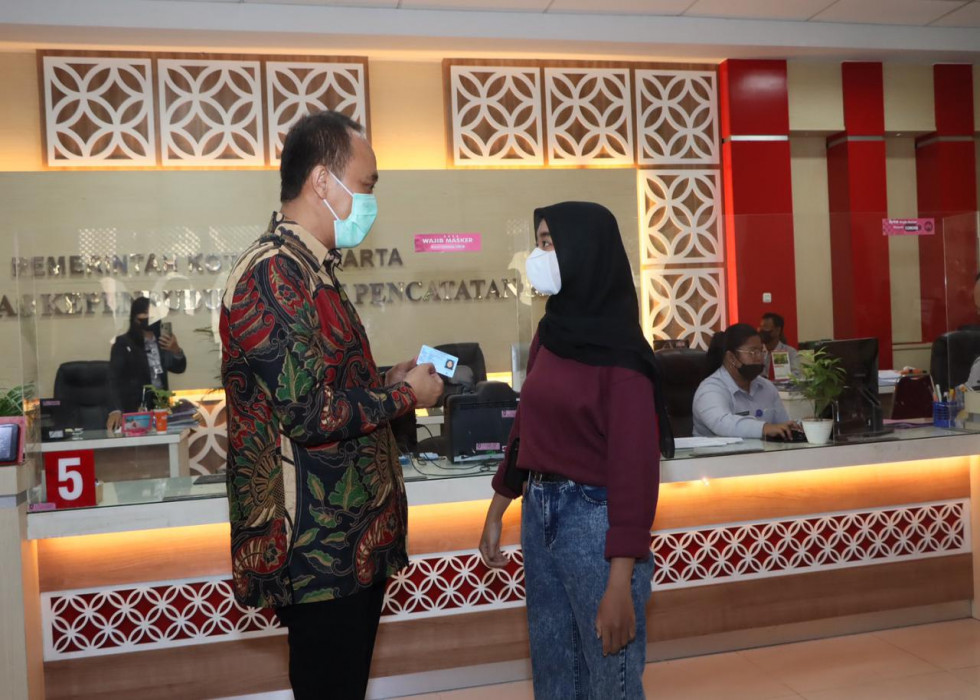 “Mulai jam berapa tadi mengurus KTP-elnya,” tanya Zudan kepada Siti, warga wajib KTP-el pemula, di Loket Pelayanan Dinas Dukcapil Surakarta, Senin (24/05/2021).