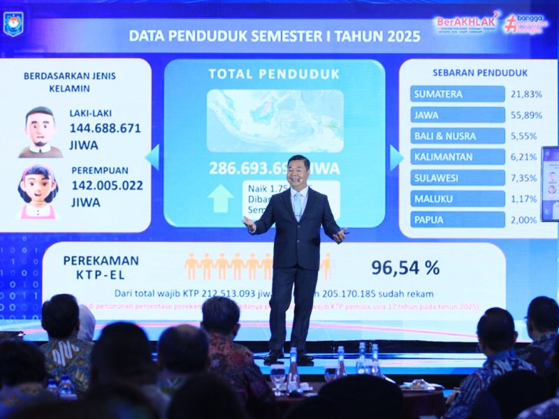 Dirjen Teguh Setyabudi menyebutkan, Ditjen Dukcapil menyusun data kependudukan Semester I Tahun 2025 per 30 Juni 2025 sebanyak 286.693.693 jiwa. Jumlah ini meningkat sebesar 1.752.156 jiwa dibanding Semester II 2024, sebesar 284.973.643 jiwa. Dari jumlah itu, sebanyak 144.688.671 jiwa adalah penduduk laki-laki, dan perempuan sebanyak 142.005.022 jiwa.