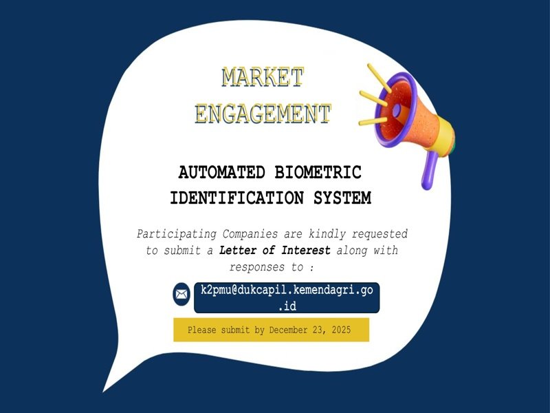Indonesia's Direktorat Jenderal Kependudukan dan Pencatatan Sipil(Dukcapil) is conducting a market engagement for the upcoming Dukcapil procurement of New ABIS and invites qualified Biometric Solution Provider to participate