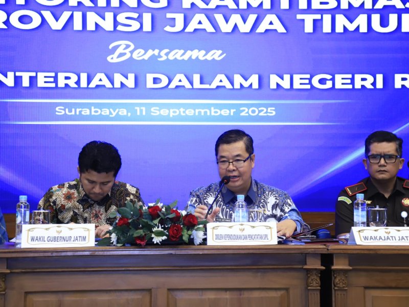 Dirjen Dukcapil Kemendagri, Teguh Setyabudi, dalam forum Monitoring Kamtibmas bersama unsur Forkopimda di Kantor Sekretariat Daerah Provinsi Jawa Timur, Surabaya, Kamis (11/9/2025). [Foto: Dukcapil/Lukman]